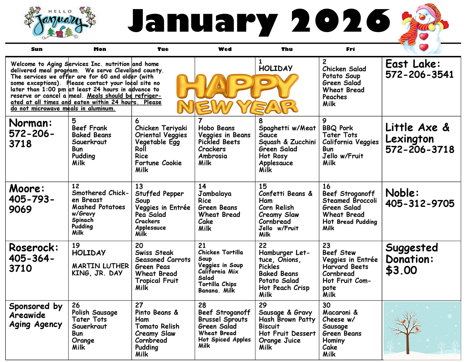 ASI provides lunch time meals, socialization, and educational programs Monday through Friday at five congregate meal sites throughout Cleveland County. There is a suggested donation of $3.00 for those age 60 and over and/or spouse of an individual age 60 and over. Adult disabled participants attending a meal site located in an independent housing facility are also eligible for a meal at the same suggested donation. There is a charge of $5.00 per meal for guests under 60 years of age.